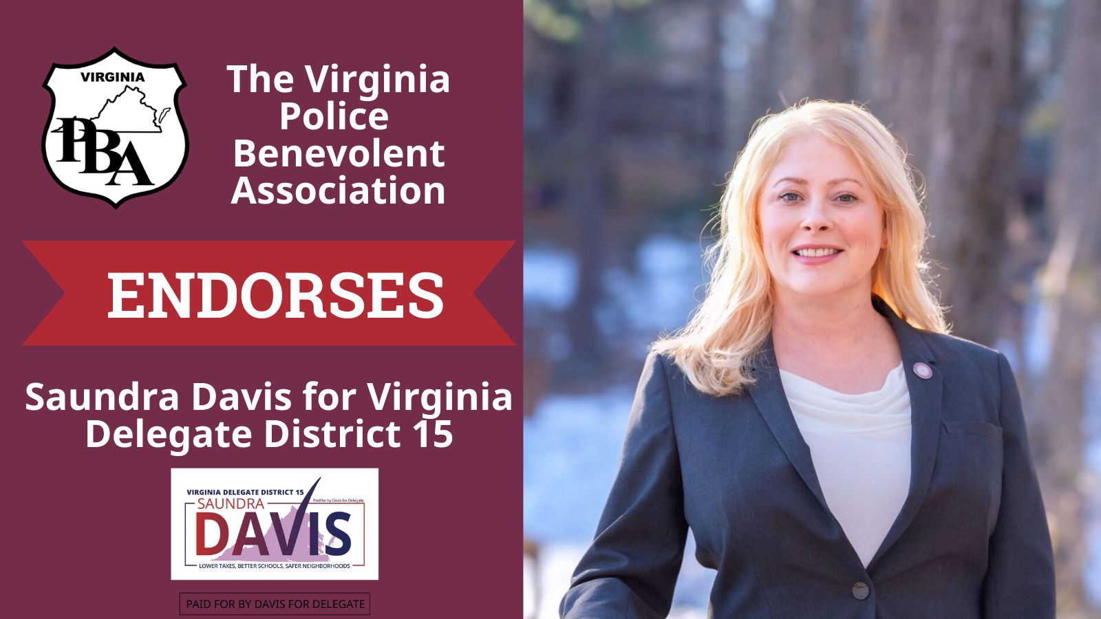 I’m proud to endorse Saundra Davis for the Virginia House of Delegates, District 15. Saundra is a strong advocate for safe communities, quality education, and accountable government. She will fight for our shared values in Richmond and deliver results for her district.